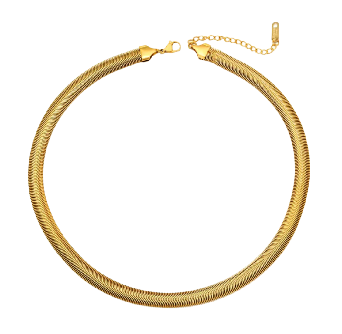 The Divina Necklace is the ultimate fusion of style and substance. Its substantial weight and unique herringbone links create a look that's both edgy and elegant, elevating your style from day to night.
