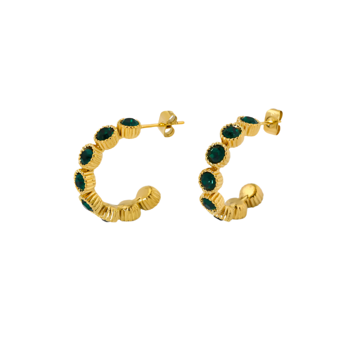 The green zircon stones add a pop of color and shine to these beautiful hoops. For the fashionable woman looking to add a touch of color to her jewelry collection.