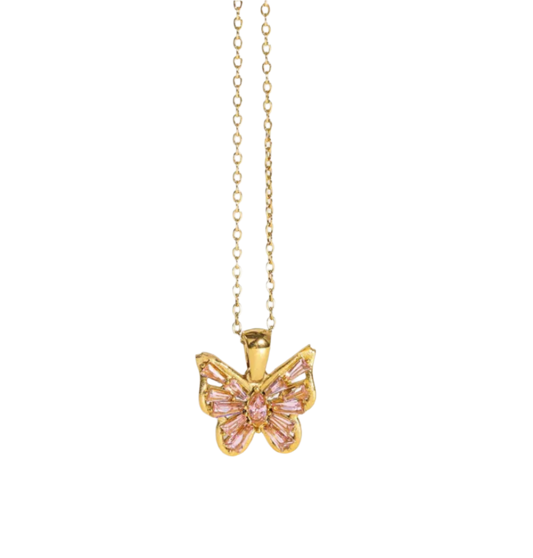 Crafted from high-quality 18K gold plated stainless steel, this tarnish-free necklace features a delicate and detailed butterfly pendant with pink zircon accents that sparkle in the light.